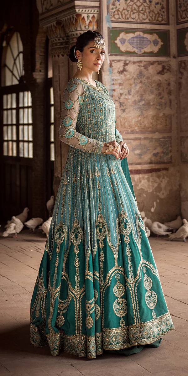 A seamless blend of vibrant shades of feroze and turquoise to craft a look that is both cohesive and dynamic. This pishwas features a versatile fusion of net and raw silk, enhancing its design potential. It is elegantly paired with a net dupatta, adorned with intricate four-sided borders and stunning floral bunches, exuding sophistication and charm.