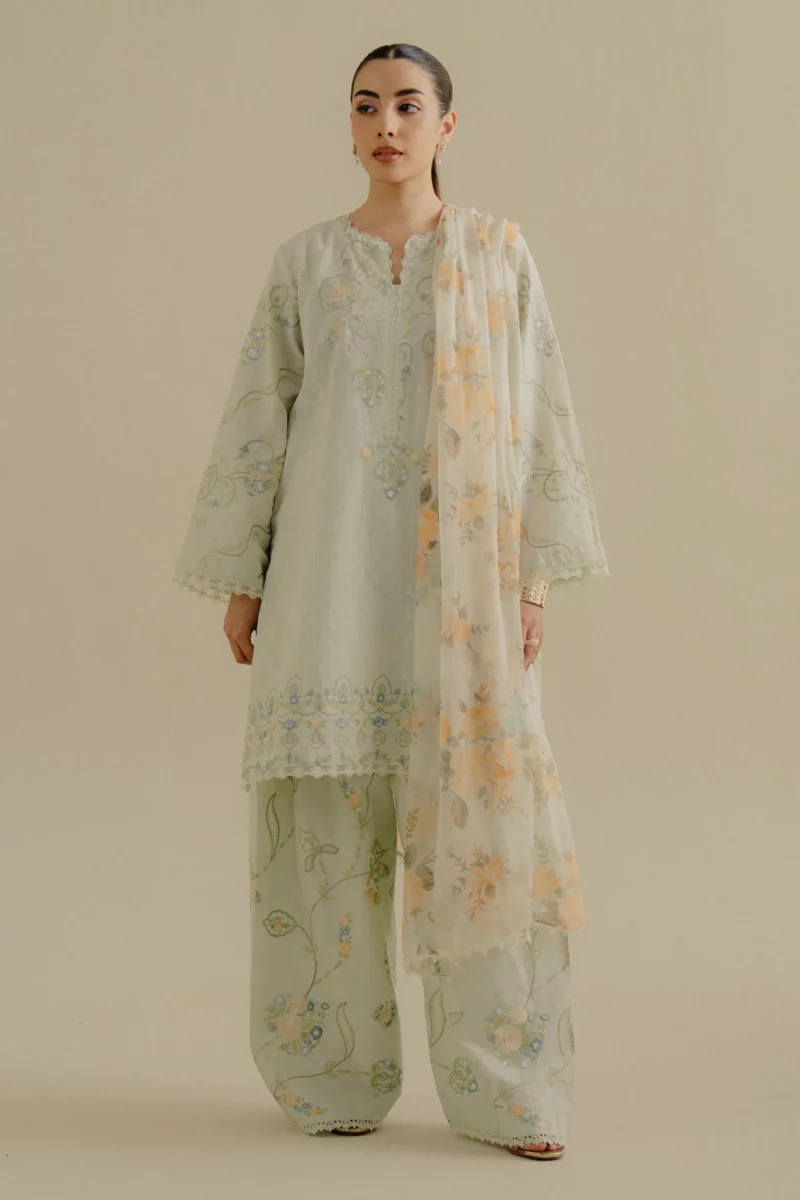 A cool mint green jacquard ensemble layered with subtle embossed patterns and detailed embroidery, paired with a light chiffon dupatta that adds a soft, fluid contrast.