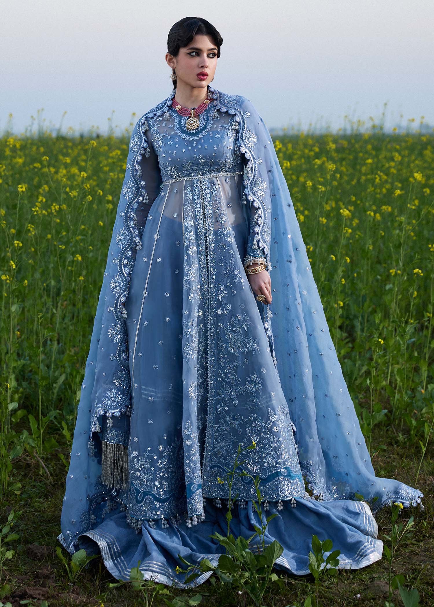 It’s a front open organza peshwas. The choli and sleeves are embroidered, and attached with embroidered panels. This peshwas is paired with Korean Raw-silk sharara, which adds a traditional touch. And the dupatta is made of organza with embroidered four side borders, giving it sophistication. This outfit is definitely a head-turner and perfect for any special occasion or event.