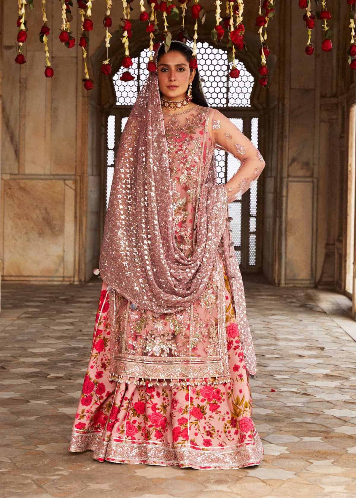 Net shirt composed with intricate emboroidery all over enhanced with printed korean raw-silk lining. Paired with the Korean Raw-silk Digital printed Lehnga. And the net embroidered sequins dupatta adds a touch of glamour to the overall look. Overall this attire is a unique and stylish addition to the warddrobes.