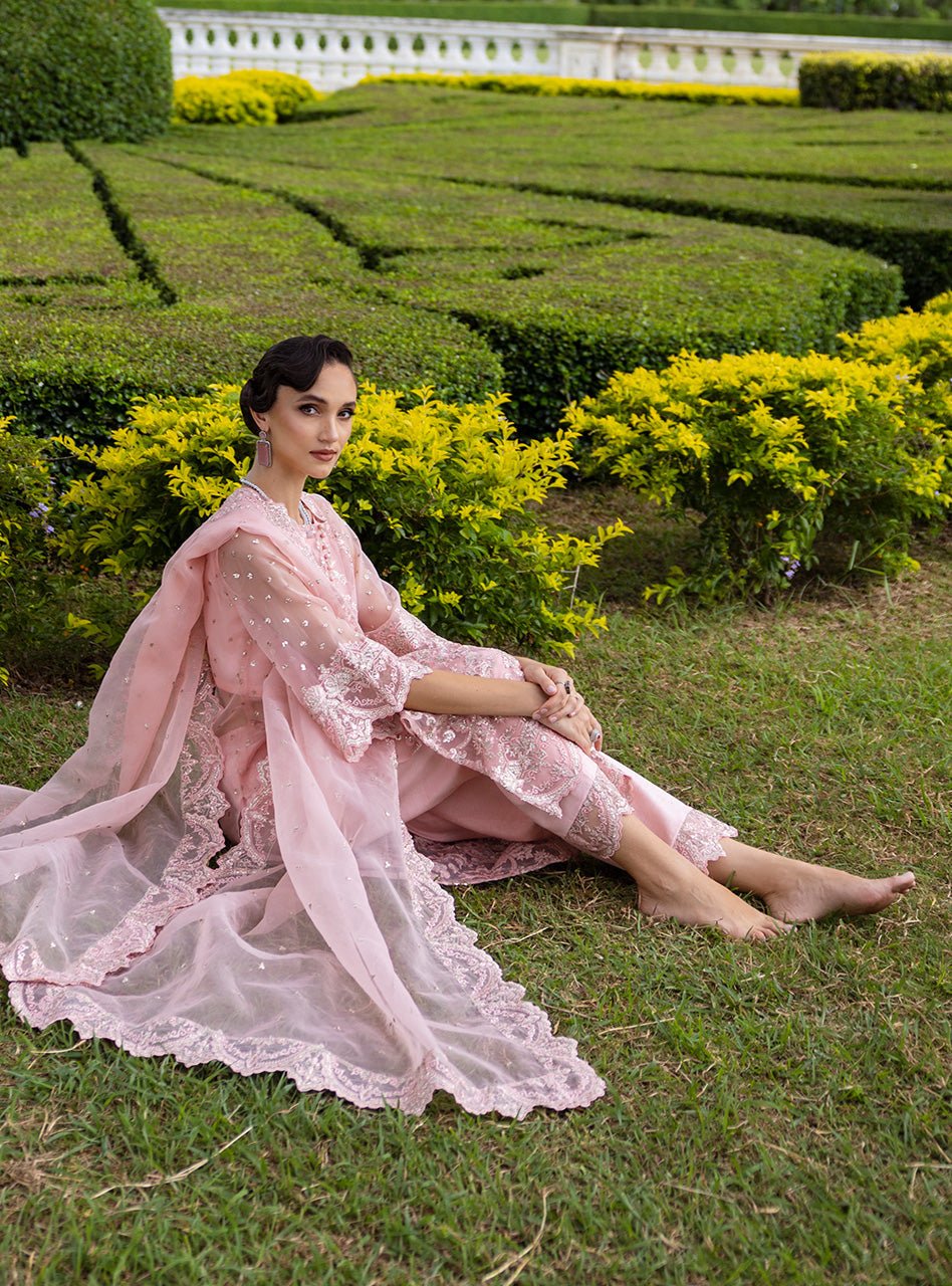 This powder pink wedding festive ensemble exudes timeless elegance with its soft, feminine hue and exquisite craftsmanship. Adorned with delicate sequin embellishments and intricate machine embroidery that seamlessly extends from the neck to the hem, this outfit offers a refined and sophisticated look. The beautifully crafted dupatta, featuring detailed borders, completes the ensemble, creating a graceful and complete look that is perfect for any special wedding festivity.